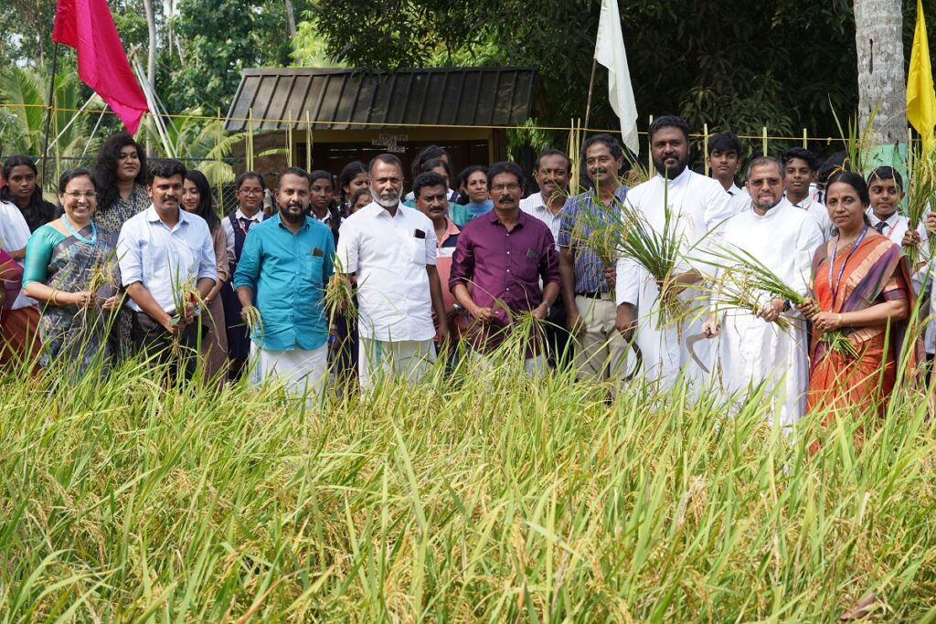 The paddy harvest was inaugurated by Mr. K.S Shaji, President Kottuvally Panchayat. The School Manager and Principal Rev. Fr. Martin Mundadan CMI presided over the function. North Paravur assistant krishi director Mr. Sasi Menon, Kottuvally Krishi Officer Mr. Athul B Manappadan felicitated the activities in the school. Vice Principal Rev. Fr. Mejit Vattoli CMI, School Academic Coordinator Ms.Anila Alexander, Headmistress Ms. Alphonsa, PTA President Mr. C V Birdy, Standing Committee Chairman Mr. Biju Pazhampilly and Mr. Sebastian Thomas, School Nature club teacher co ordinator, Ms Anitha K A felicitated the function.