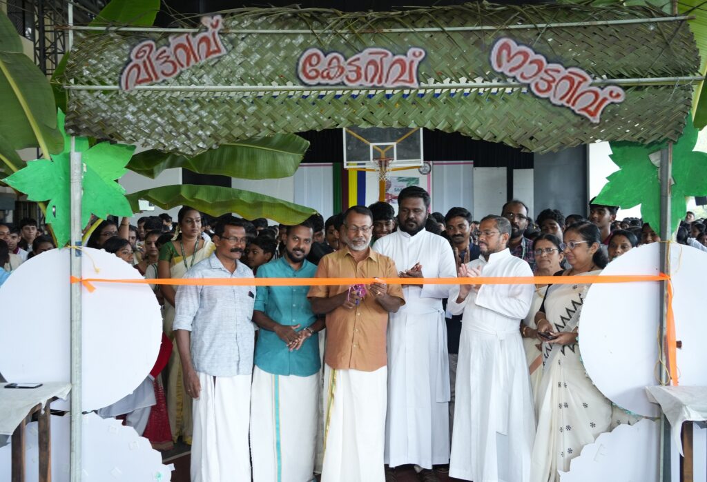 On Kerala Piravi Day, Koonammavu Chavara Darsan CMI Public School organized an exhibition titled “Veettarivu, Kettarivu, Nattarivu” under the leadership of the School Manager and Principal, Rev. Fr. Martin Mundadan CMI, and PTA President Mr. Joseph John. This grand event, held in the school auditorium, was a unique experience for both teachers and students. The exhibition was inaugurated by Kottuvally Panchayat President Suresh K. S., with Panchayat members and students from various classes showcasing displays of history, books, medicinal plants, antiques, traditional Kerala snacks, Kera stall, clay pottery, and a retro-style tea shop.